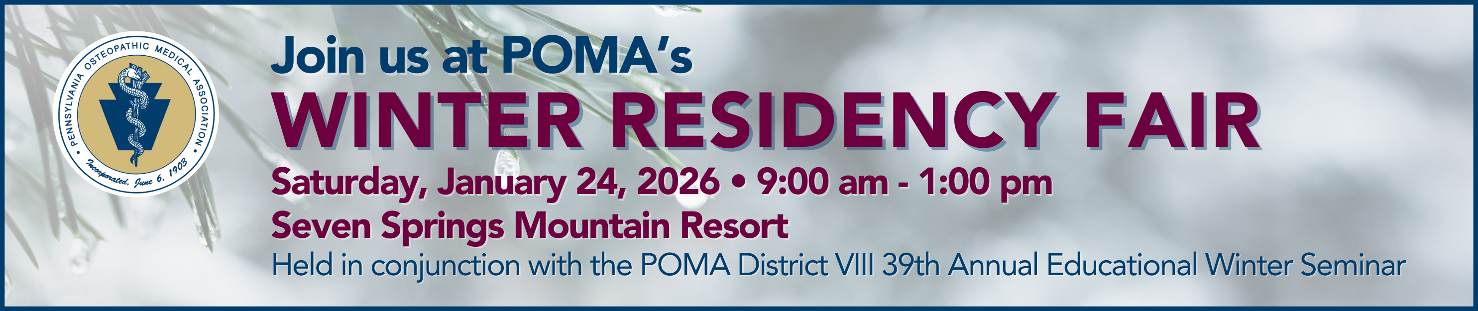The POMA District VIII Winter Seminar is designed with you in mind! The live conference will be held January 22-25, 2026 at Seven Springs Mountain Resort and simulcast live for virtual participation. All content will be recorded and made available for on-demand viewing through February 2026. Back by popular demand, District 8 will host our second POMA Winter Residency Fair. This event is bringing together residency programs from across the Commonwealth into one place for students to network and learn more about residency and training opportunities. The fair will be held Saturday, January 24 from 9am - 1pm. More information coming soon! Take advantage of the family-friendly atmosphere and bring the whole family! The mountain will be ready for skiing and snow tubing. Indoors you can play in the arcade and bounce house or relax in the spa. We also have daily family-friend social events planned throughout the conference. Our annual District VIII member meeting will be held on Saturday afternoon. We'll provide updates impacting our region in Southwest Pennsylvania, as well as from across the state and country. We'll also select local members to lead District VIII and represent the region at the state and national level. Get involved and plan to participate! Education Program View the Tentative ScheduleThis year's program will offer up to 24 Category 1A AOA CME credits and 24 AMA PRA Category 1TM Credits. POMA is an accredited provider of AOA and AMA credits by the AOA and ACCME. The 2026 POMA District VIII Winter Seminar has been planned and implemented in accordance with the accreditation requirements and policies of the AOA and ACCME. Conference Registration Online RegistrationDownload Registration Form (.pdf)